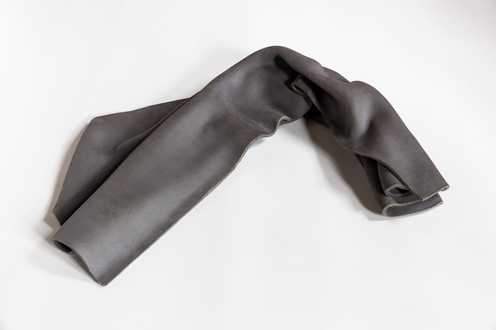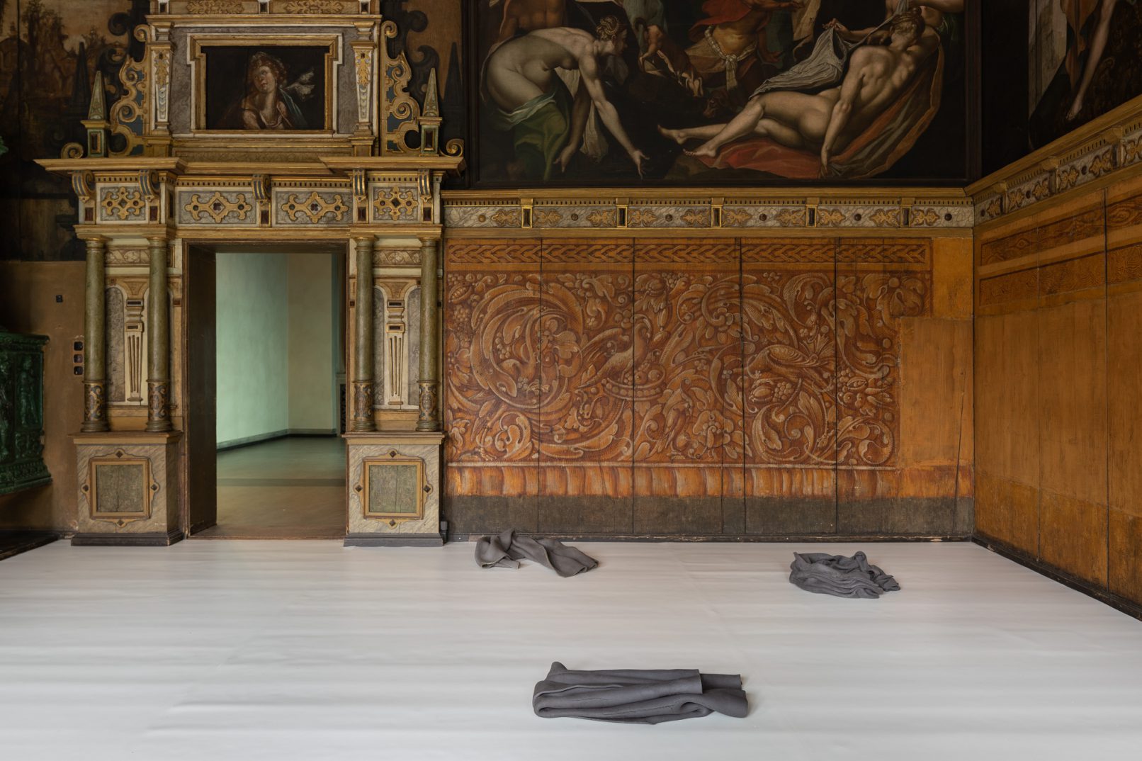 Weißer Tanzboden ist im historischen Festzimmer des Kunstmuseums Moritzburg vollflächig verlegt. Darauf lagern Faltenwürfe aus schwarzem Ton. In Korrespondenz zu den reich bemalten Wänden ziehen die dunklen Keramiken auf hellem Grund eine eigenständige Ebene ein, die eine Begegnung von Werk, Raum und Betrachter auf gleichem Niveau ermöglicht.