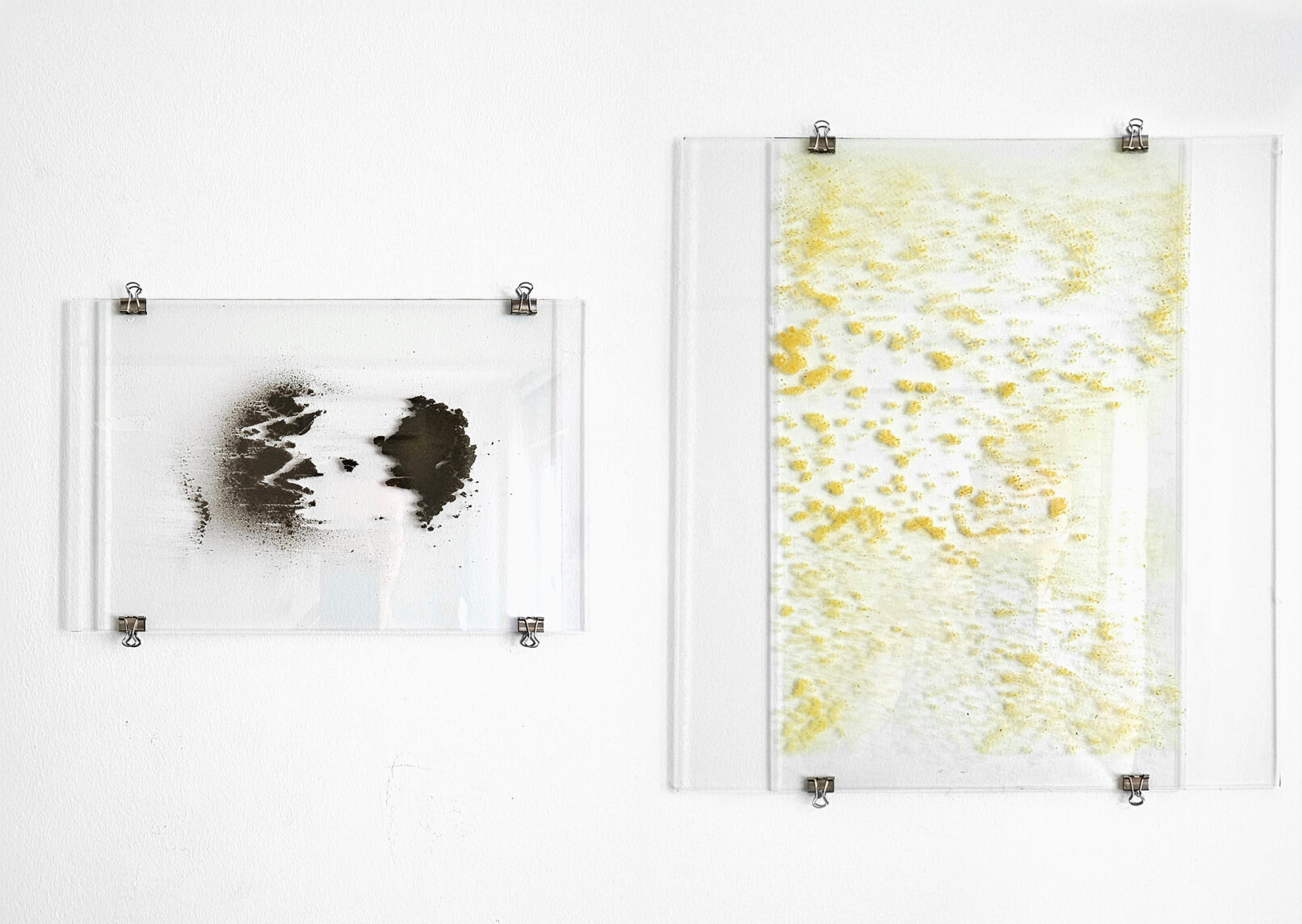 Im Frühjahr zeigt sich Istanbul als „Stadt der Tulpen“: Üppige Blumenrabatten fluten die Parkanlagen. Im April sammelte ich im Gülhane-Park die Blütenstände violetter, gelber, rosa, weißer, pinker, weißgelber, roter und dunkelroter Tulpen. Der daraus gewonnene Blütenstaub ist gelb oder schwarz und variiert in Farbnuancen. Als reines Pigment ist er zwischen zwei Glasscheiben fixiert, die teilweise gegeneinander verschoben wurden.
