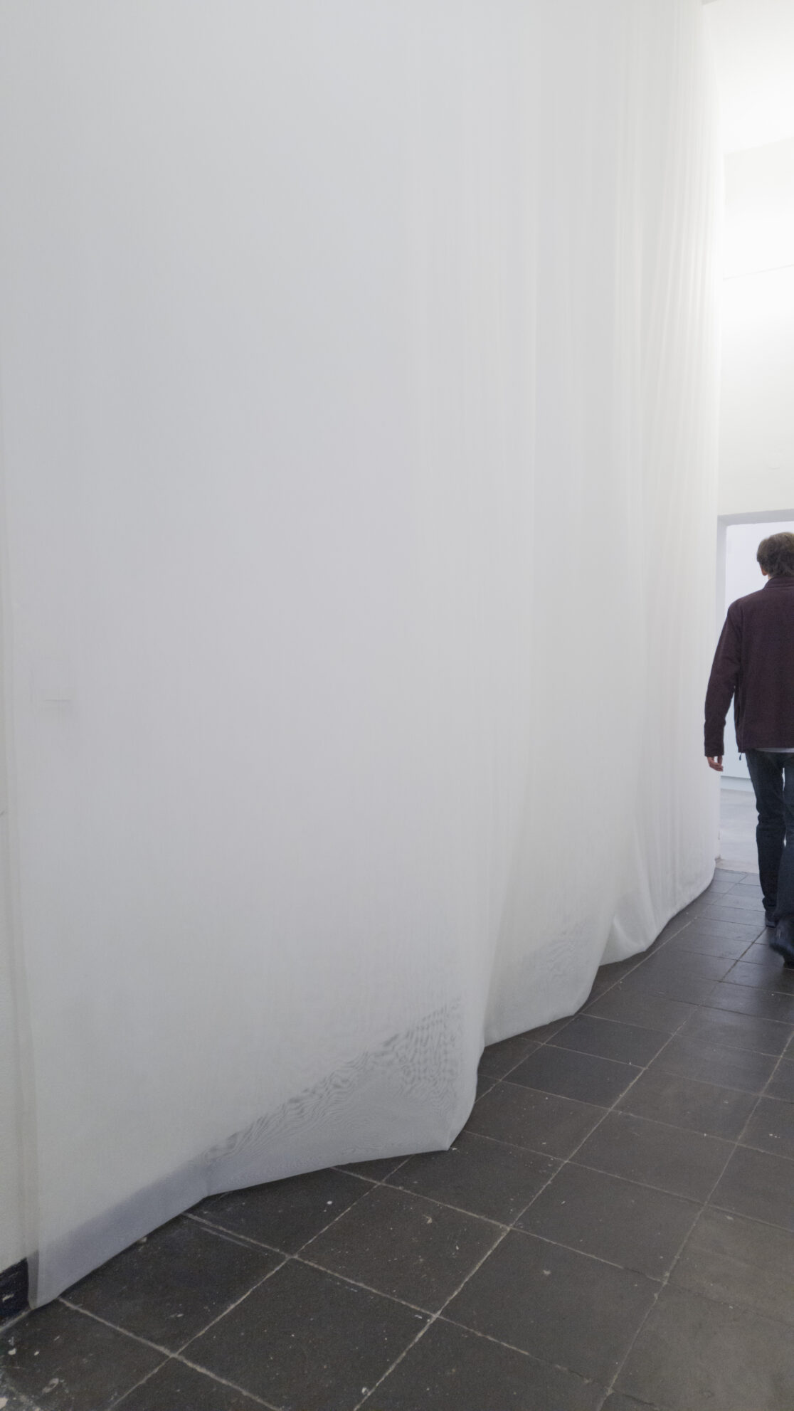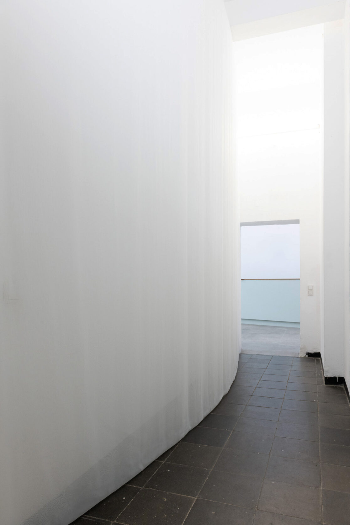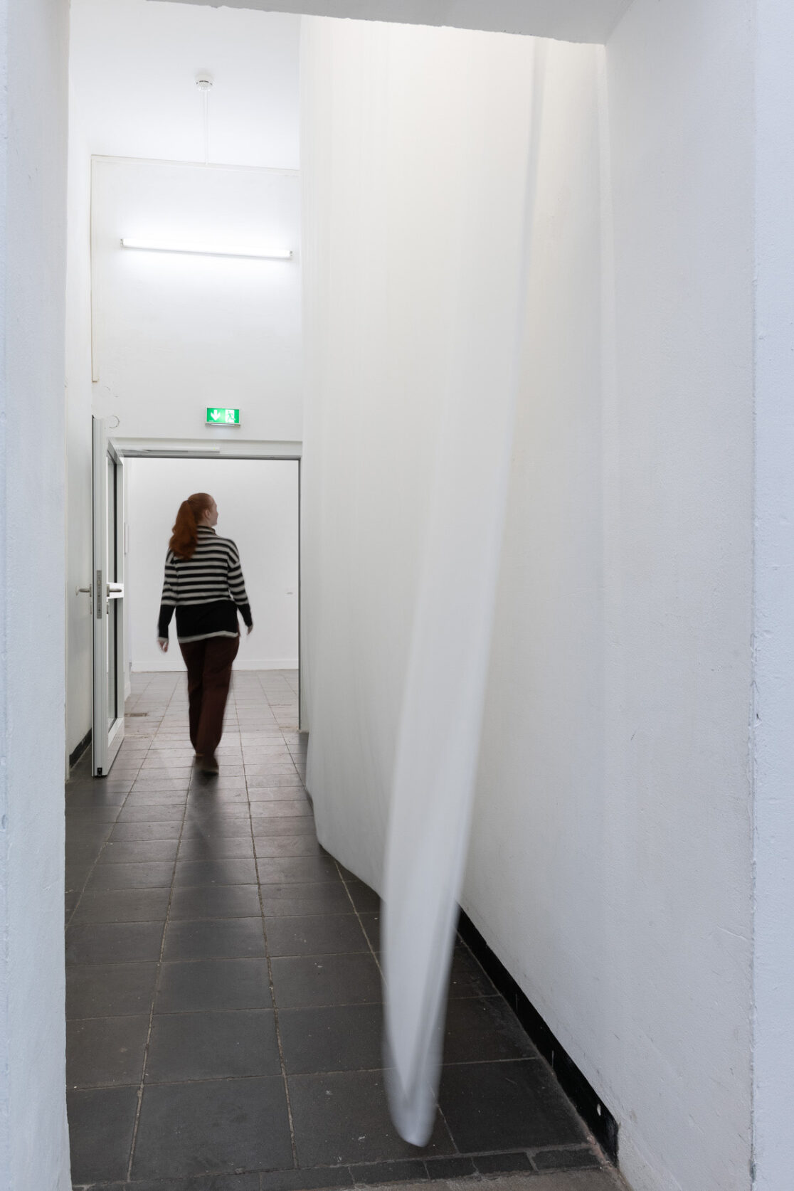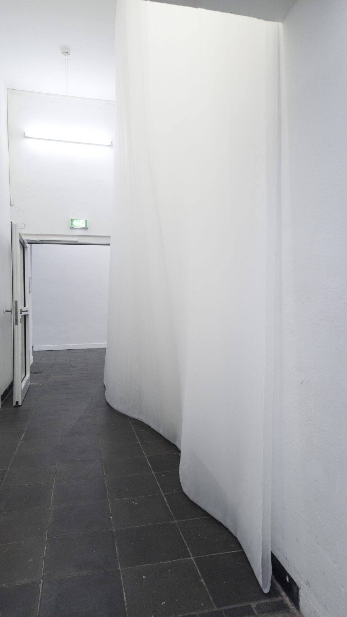 Ein schmaler Flur, der die Ausstellungsräume im vorderen und hinteren Teil des Erdgeschosses im Künstlerhaus Dortmund verbindet, ist „Raum als Ort“ und zugleich weder noch. Er ist eine Transferzone, eine Passage, die von hier nach dort führt. Lose vor der hohen freien Wand ist flächenfüllend eine transluzente Membran in leicht bauchiger Wölbung gehangen. Sie schwankt sacht und gerät im Vorübergehen in sanfte Wallungen wie eine Wasseroberfläche. Angestoßen vom Luftstrom den eine gehende Person erzeugt ist die Bewegung selbst hier formgebender Prozess.