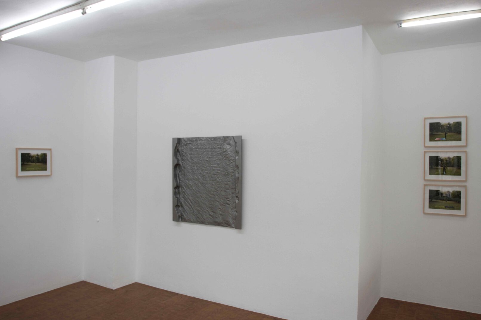 Die durch die Aktion erzeugte Grasprägung soll zu sehen sein. Dafür ist eine Glasplatte im gleichen Format neben diese gelegt. Die Situation verändert sich über die Dauer der Ausstellung, das Gras erholt sich und mit dem Laubfall bleibt einzig das Glasdisplay sichtbar, von dem der Wind die Blätter fegt.